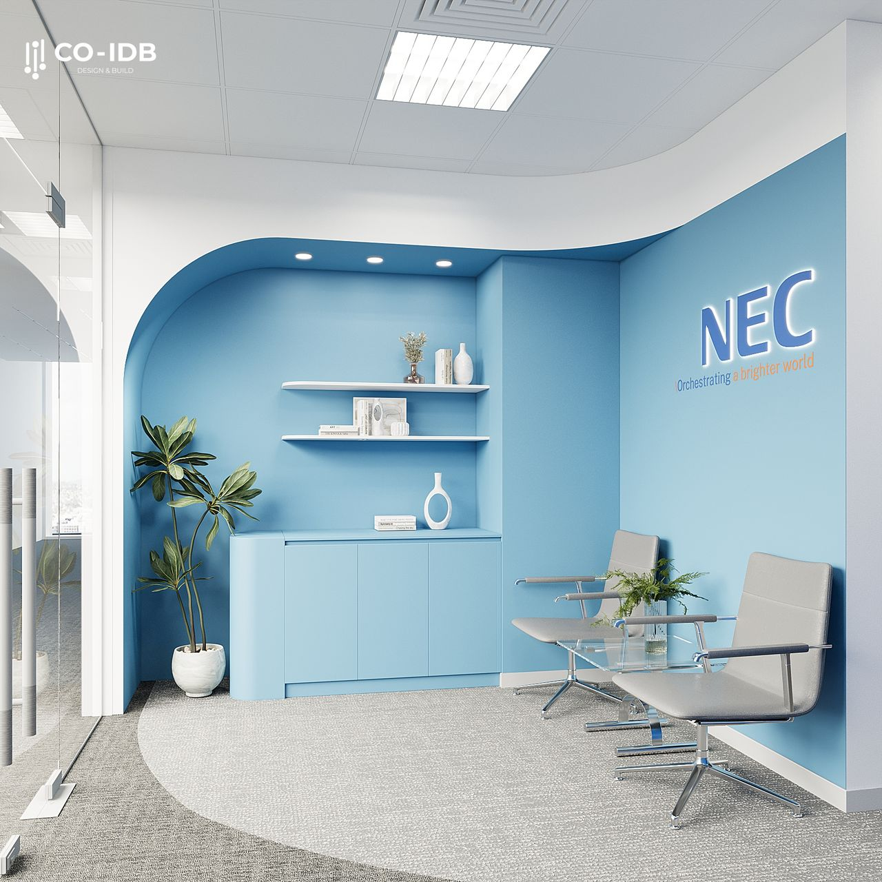 Thiết kế sử dụng màu sắc chủ đạo lấy cảm hứng từ nhận diện NEC: tông xanh dương kết hợp với sắc trắng và xám trung tính để tạo nên sự hiện đại, tinh tế. Vật liệu chính bao gồm kính trong suốt, gỗ công nghiệp và kim loại, mang đến cảm giác vừa sang trọng vừa bền vững. Logo thương hiệu và các chi tiết đồ họa được nhấn mạnh tại khu vực sảnh và không gian cộng tác, giúp tăng cường nhận diện và khẳng định bản sắc doanh nghiệp.
