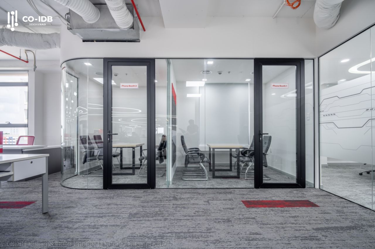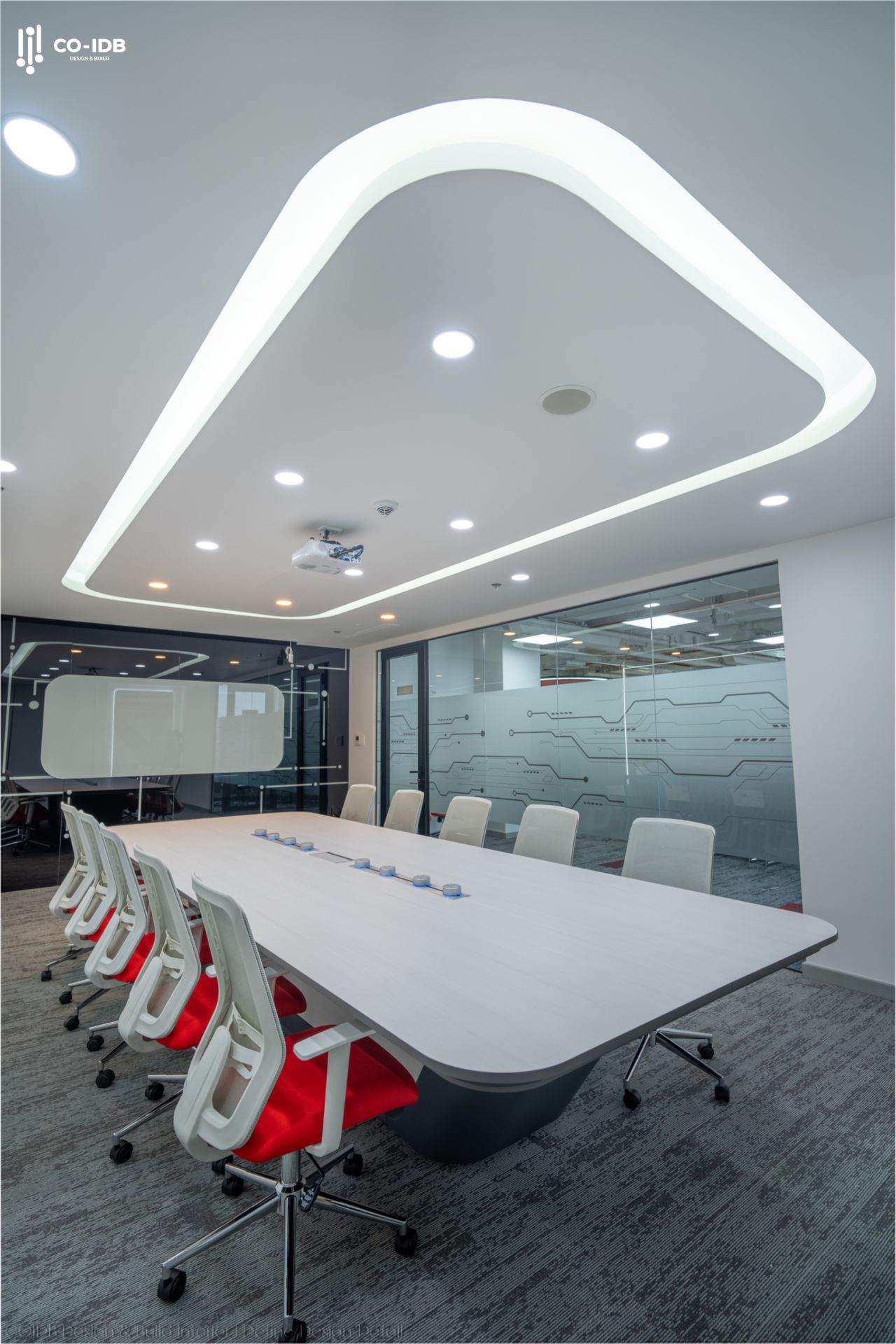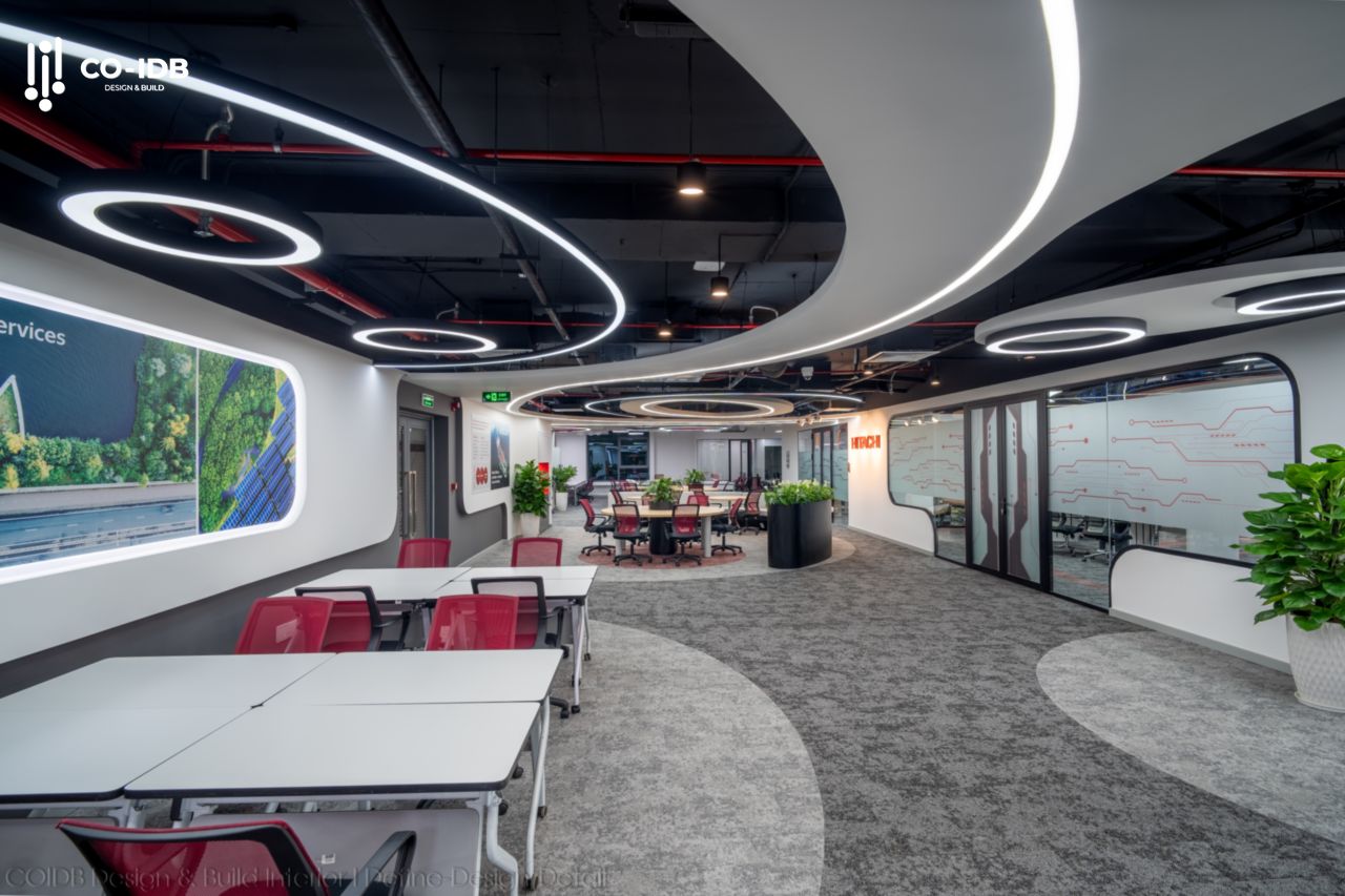 Những điểm nhấn như vách kính họa tiết mạch điện tử, ghế đỏ, đường line thảm và logo phát sáng không chỉ giúp định vị thương hiệu mà còn mang đến cảm xúc mạnh mẽ về một doanh nghiệp công nghệ tiên phong.