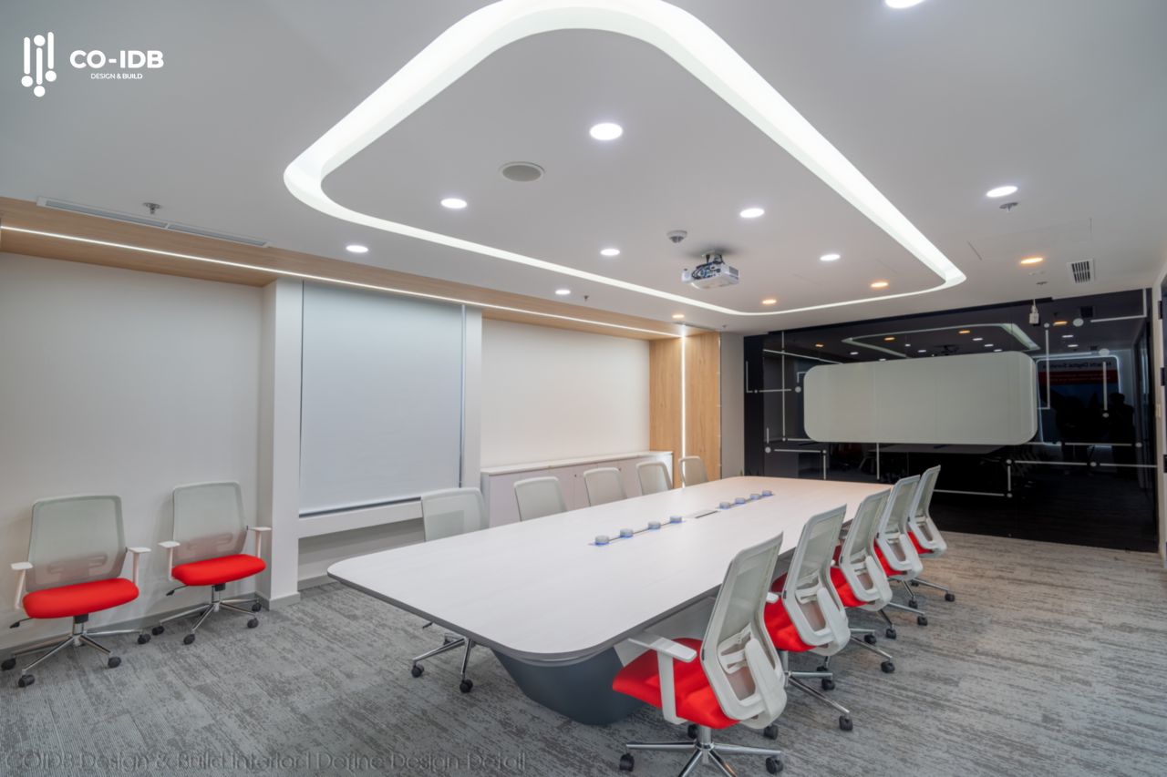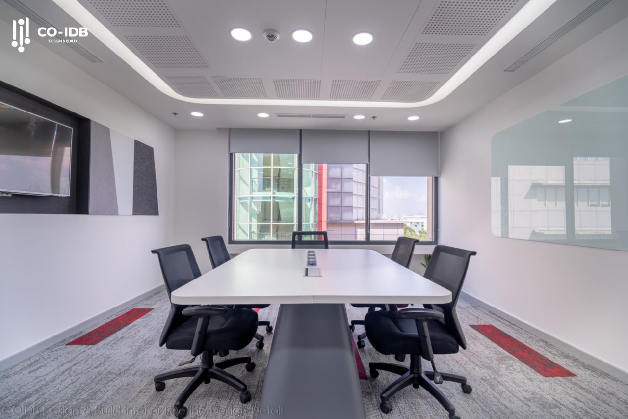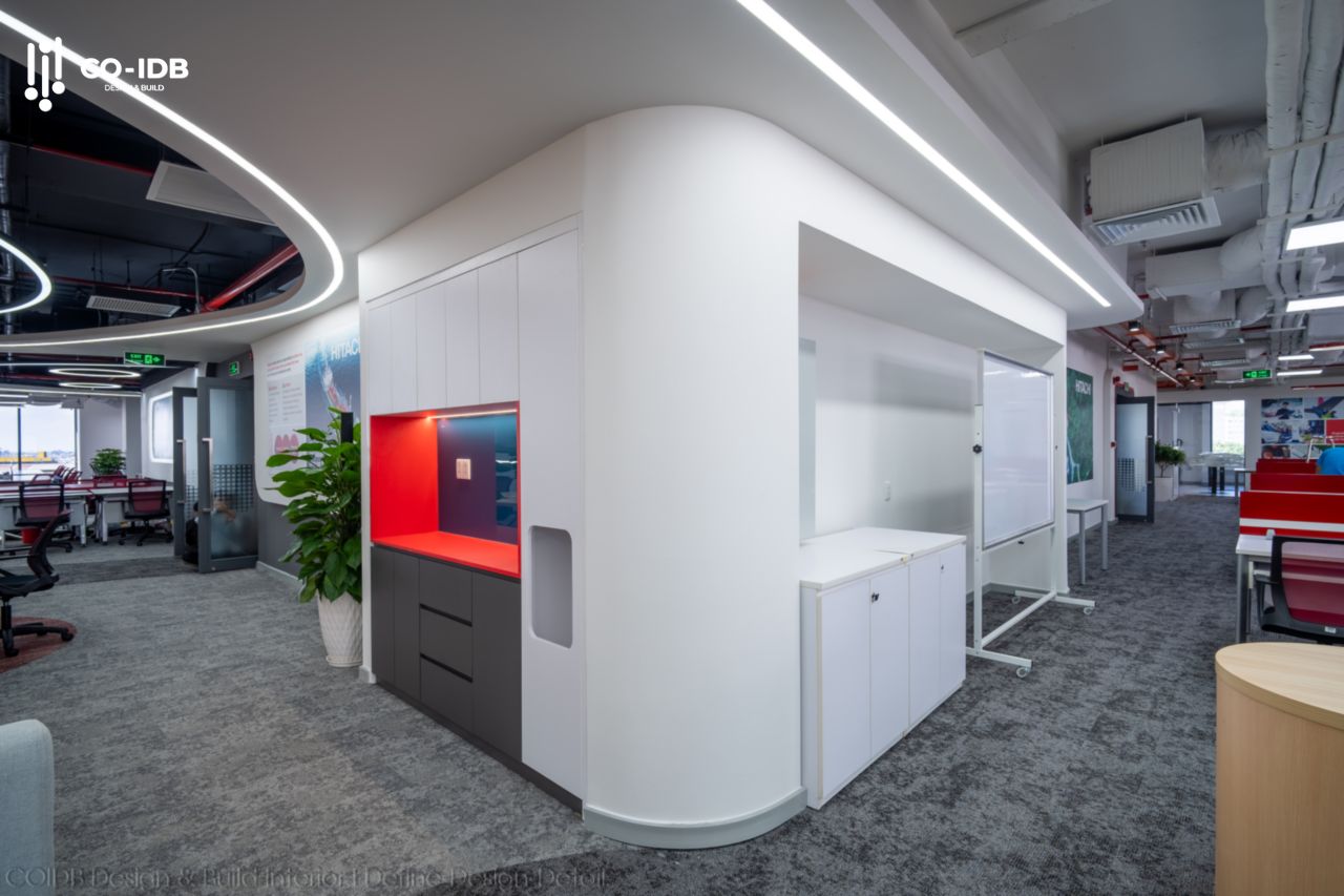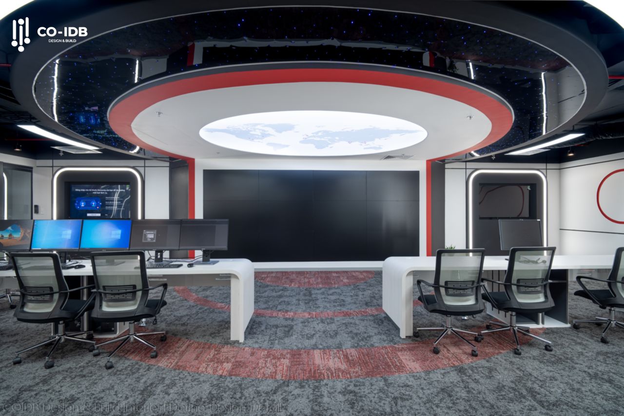 Những điểm nhấn như vách kính họa tiết mạch điện tử, ghế đỏ, đường line thảm và logo phát sáng không chỉ giúp định vị thương hiệu mà còn mang đến cảm xúc mạnh mẽ về một doanh nghiệp công nghệ tiên phong.