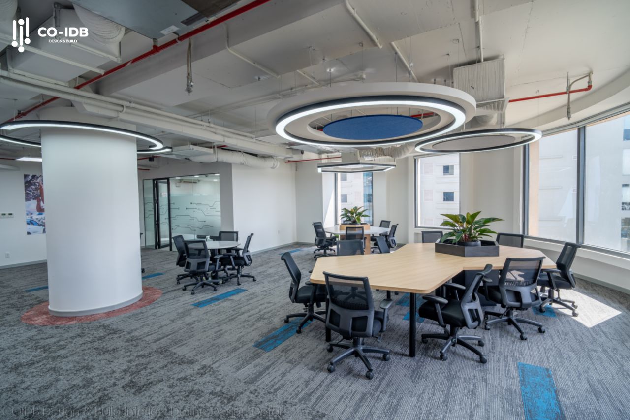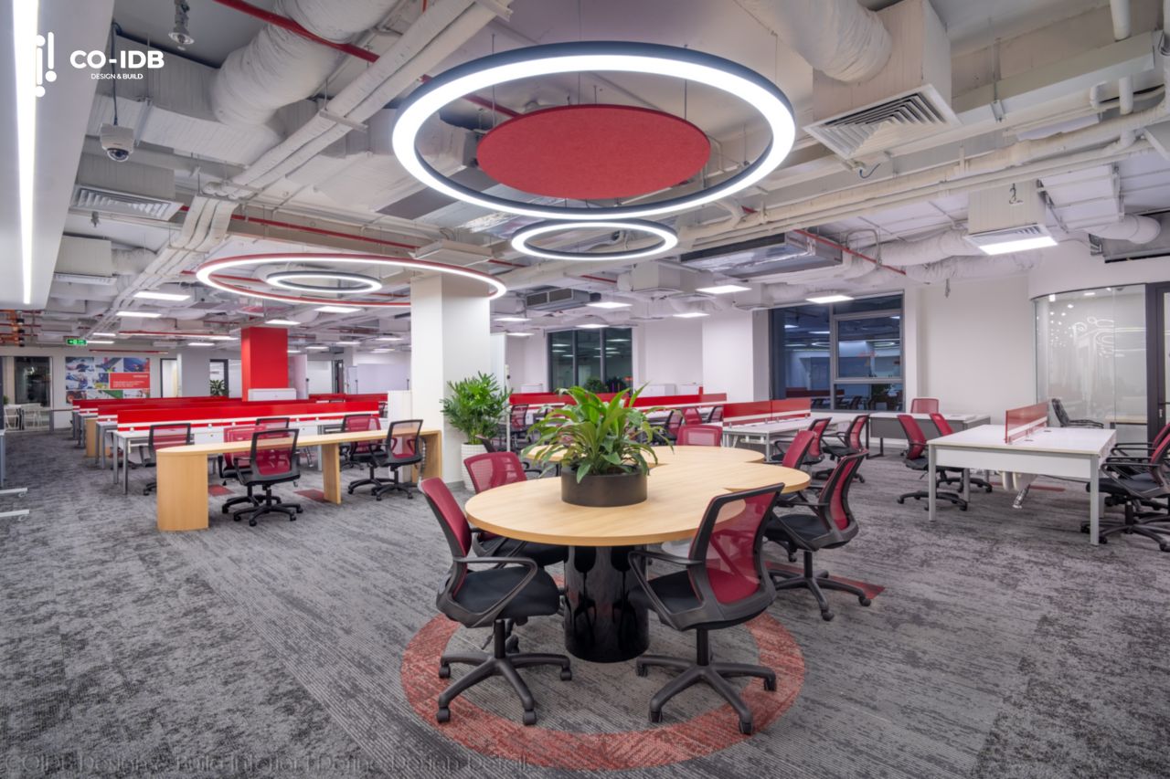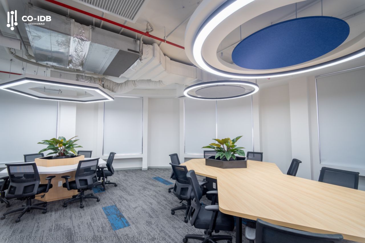 Hệ trần kỹ thuật mở kết hợp cụm đèn hình khối học hiện đại tạo nên đặc trưng nhận diện của một văn phòng công nghệ, đồng thời giúp tối ưu chiều cao không gian.
