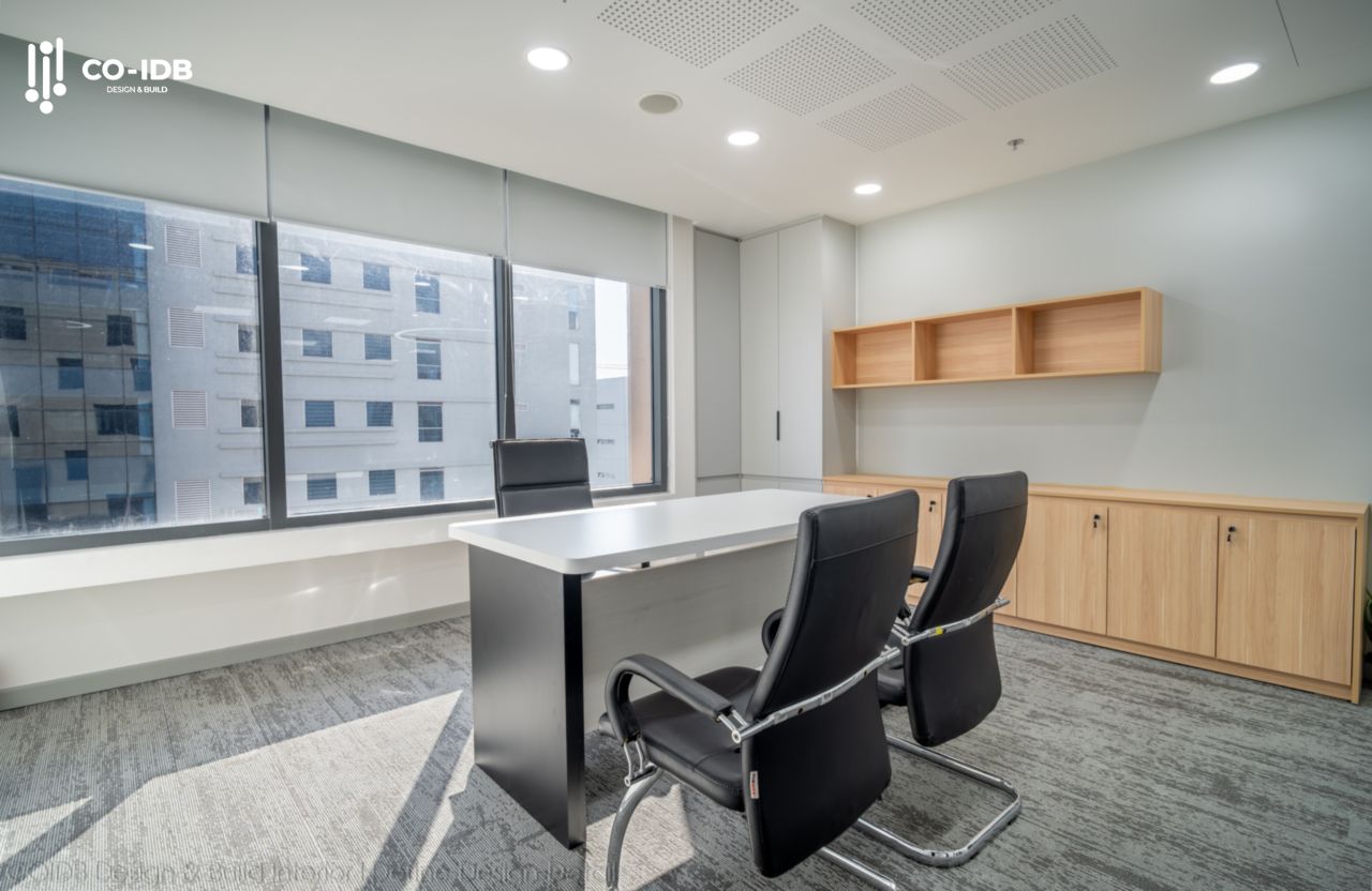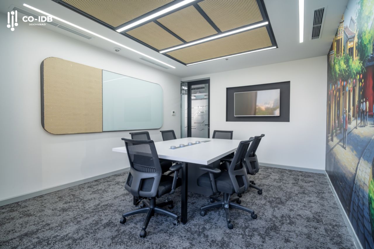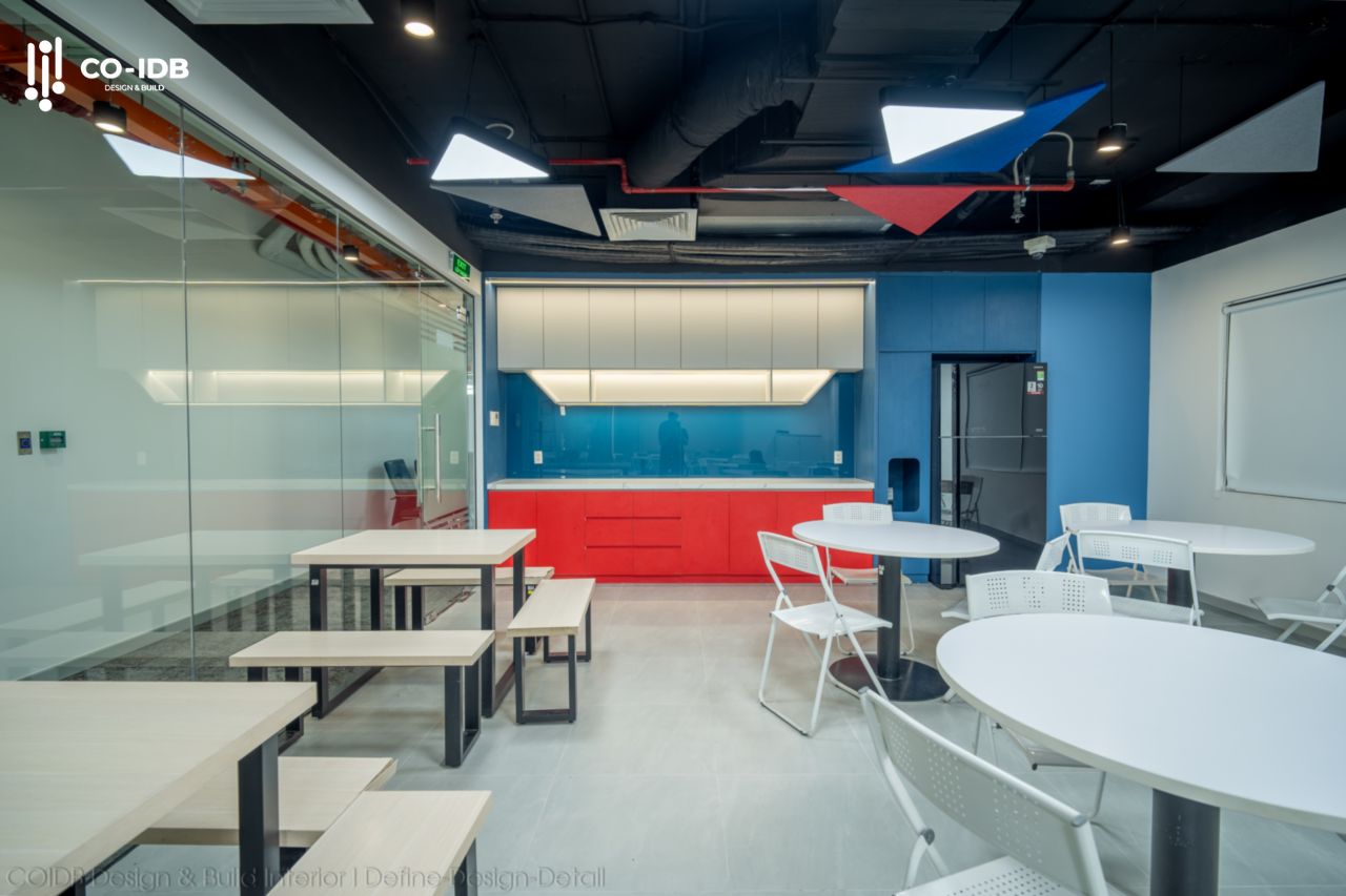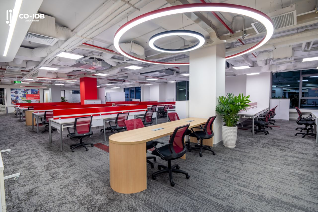 Hệ trần kỹ thuật mở kết hợp cụm đèn hình khối học hiện đại tạo nên đặc trưng nhận diện của một văn phòng công nghệ, đồng thời giúp tối ưu chiều cao không gian.