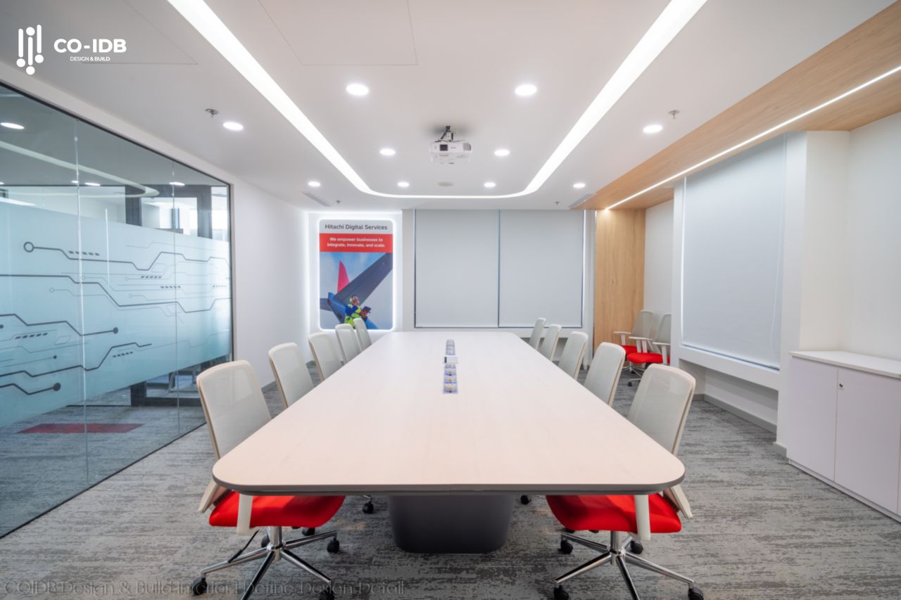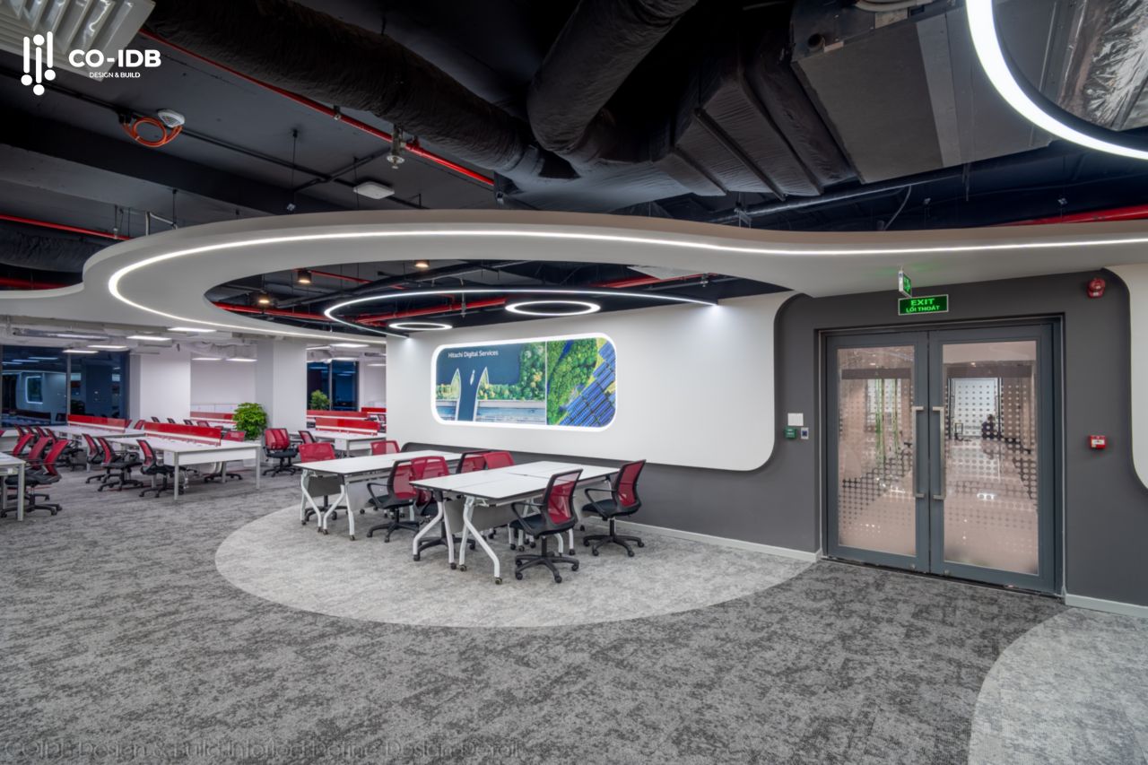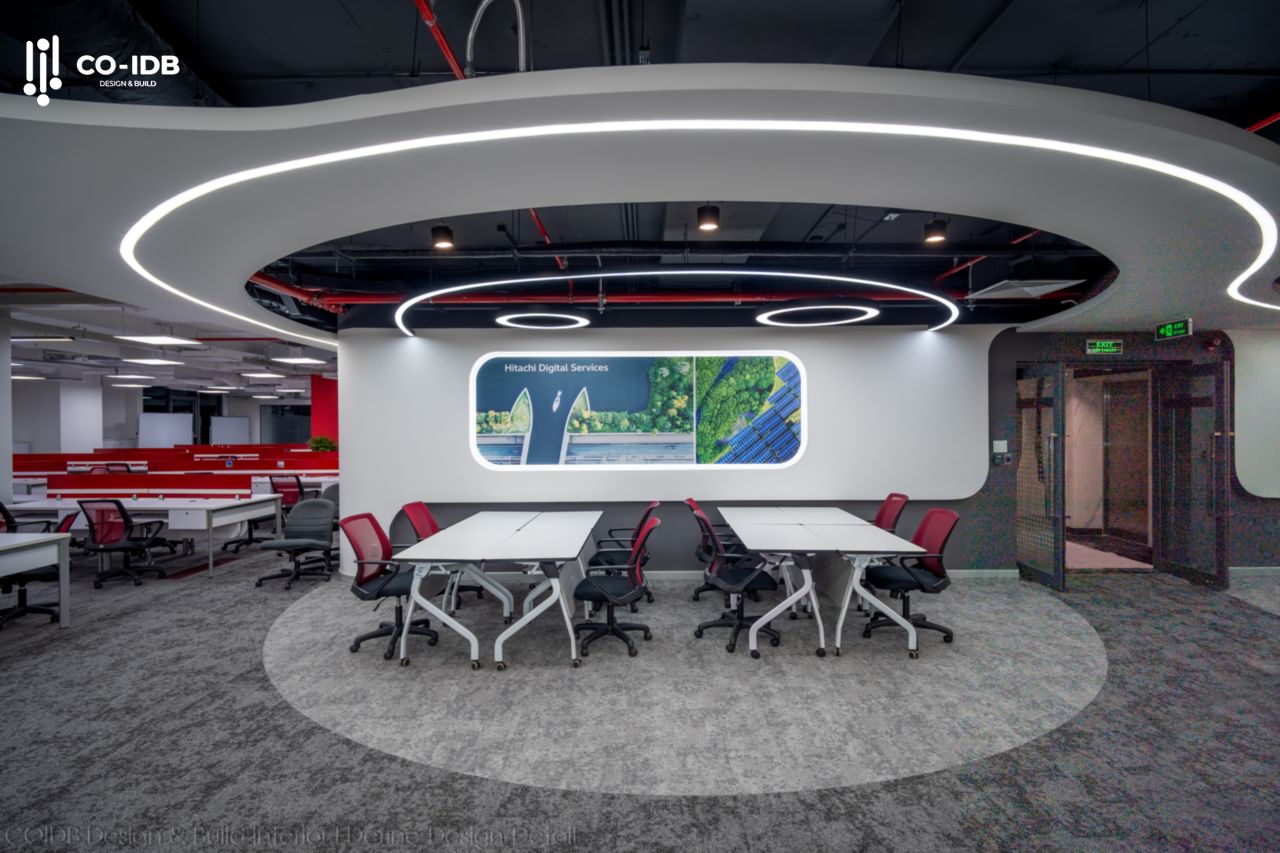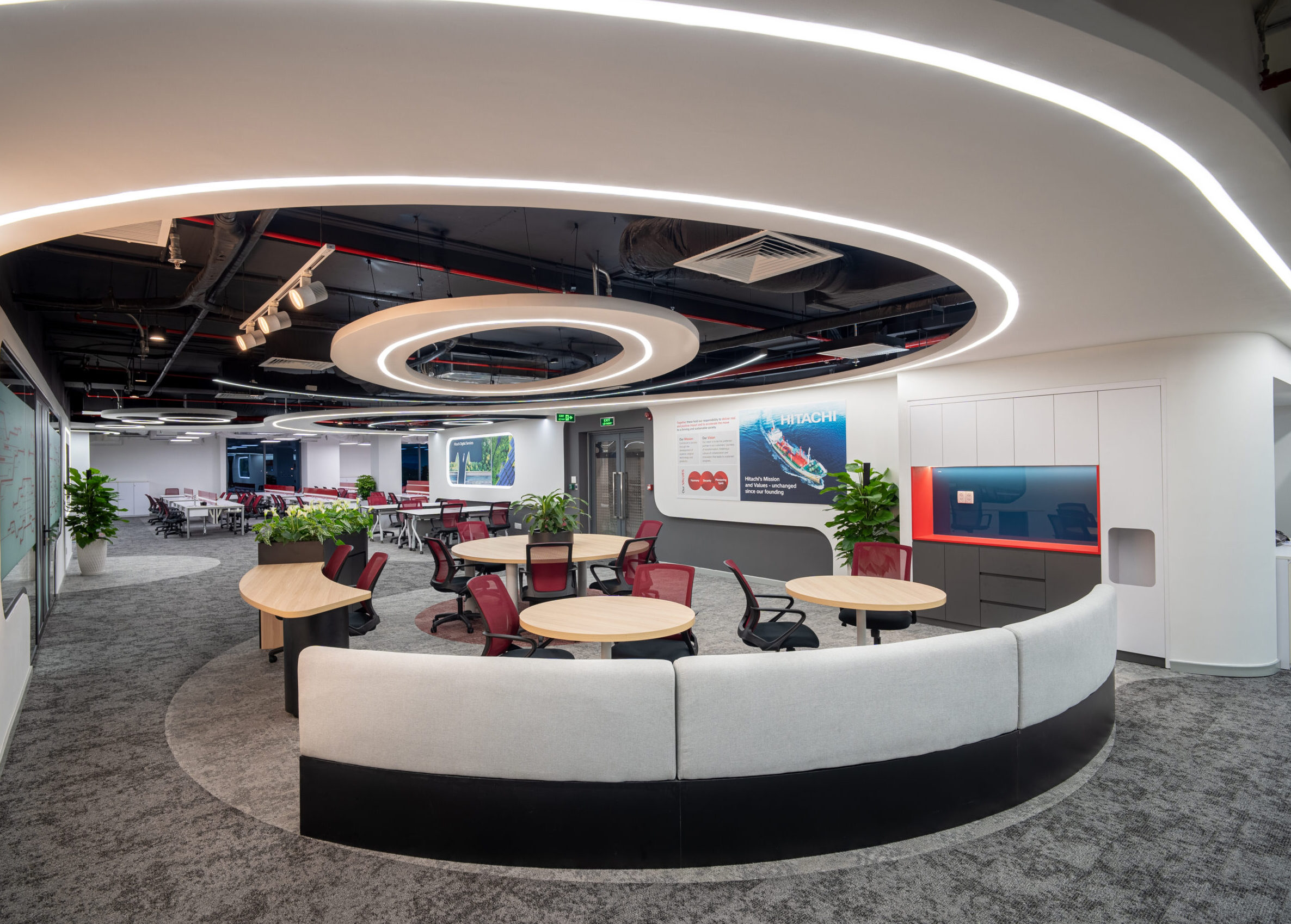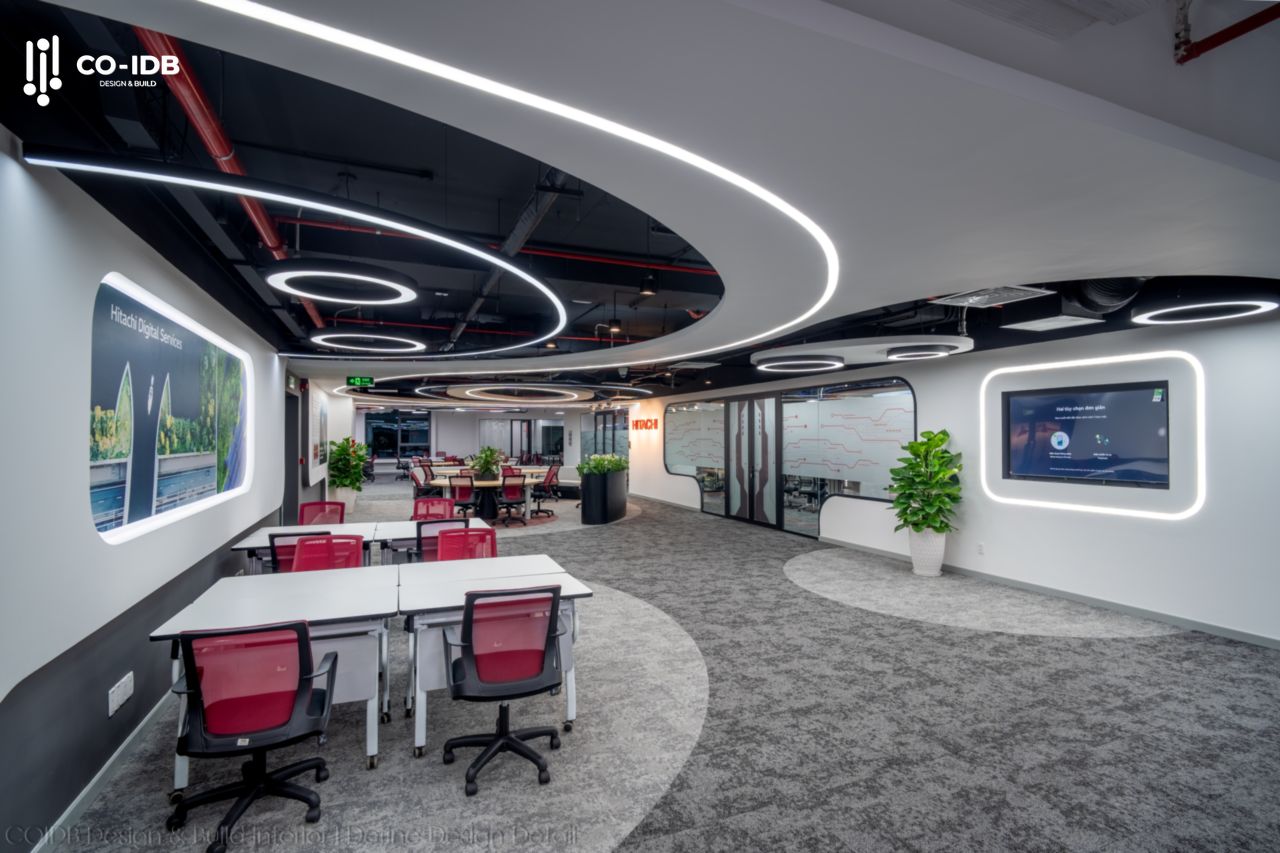 Không gian lấy màu trắng và xám trung tính làm nền, kết hợp với sắc đỏ chủ đạo – biểu tượng cho năng lượng, tốc độ và tinh thần đổi mới của Hitachi.