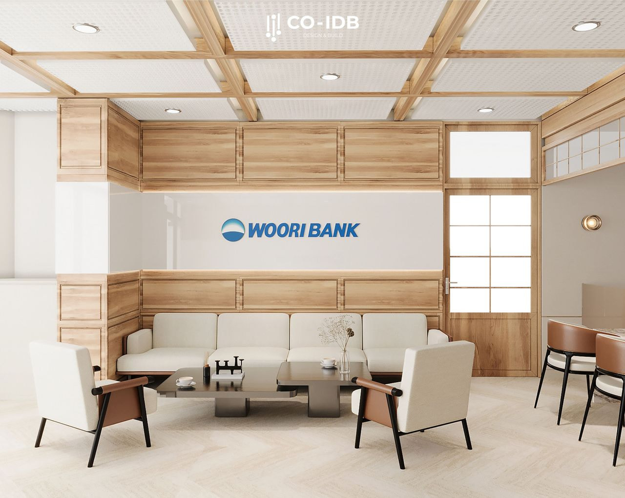 Tông màu chủ đạo của dự án là xanh navy – trắng – xám sáng, được lựa chọn dựa trên bộ nhận diện thương hiệu toàn cầu của Woori Bank. Màu xanh navy tượng trưng cho sự tin cậy, ổn định; trắng và xám giúp không gian sáng sủa, hiện đại nhưng vẫn trang trọng.