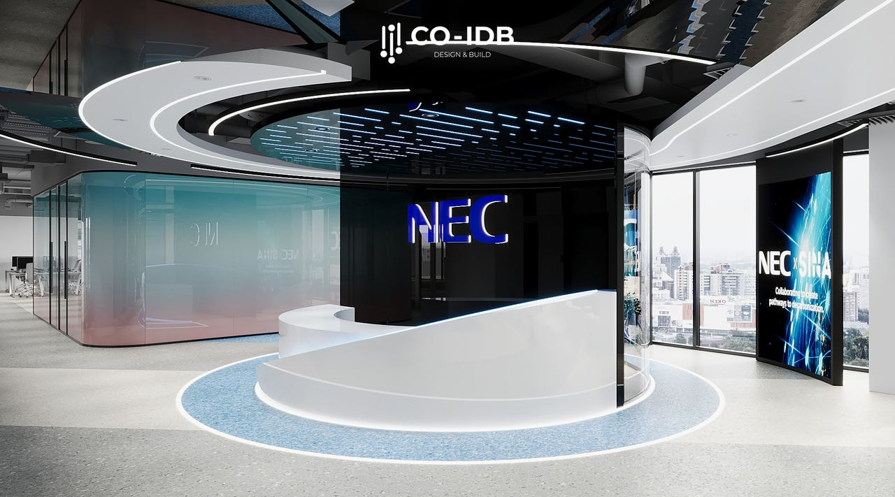 The main blue tone combined with white and gray shows trust. Transparent glass, stone surfaces, light-colored wood and metallic details bring a high-class feel. The glowing NEC logo with the circular ceiling light system and interactive LED wall panels are strong highlights, honoring the leading technology brand.