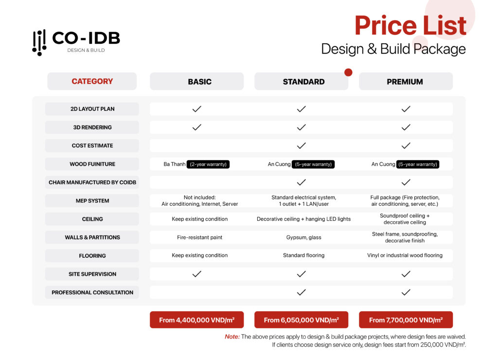 The cost of office interior design and construction is one of the biggest concerns for businesses. To give you an overview and help plan an effective budget, COIDB outlines the main factors affecting the quotation: